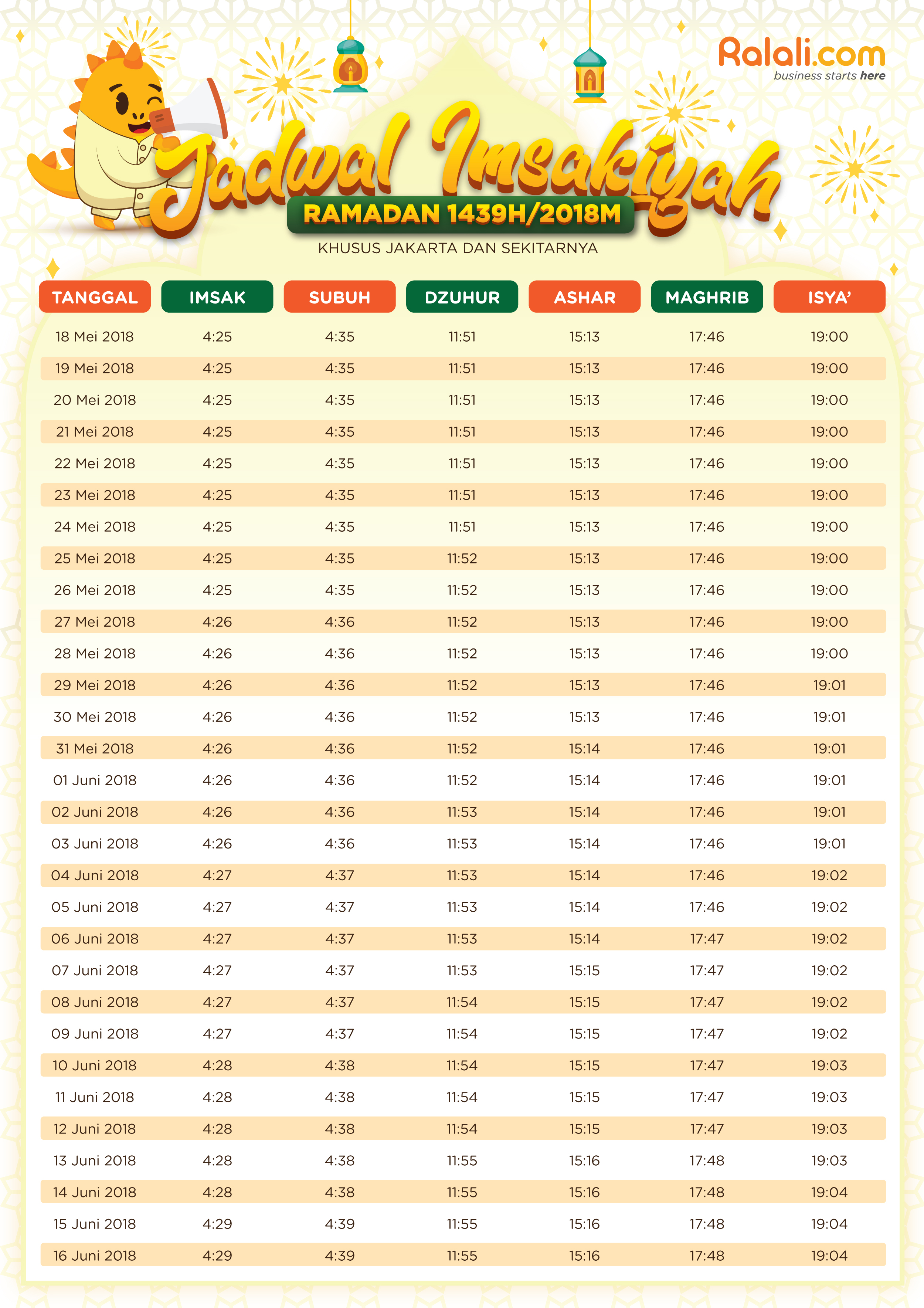 [ Jadwal Imsakiyah 2018 untuk Wilayah Jakarta dan Sekitarnya] — Ramadhan adalah bulan penuh ampunan. Jangan lupa untuk senantiasa beribadah tekun penuh komitmen kepada Yang Maha Kuasa agar ibadah kita diterima di sisi-Nya. Baca Jadwal Imsakiyah 2018 untuk mempermudah puasa Anda tahun ini.